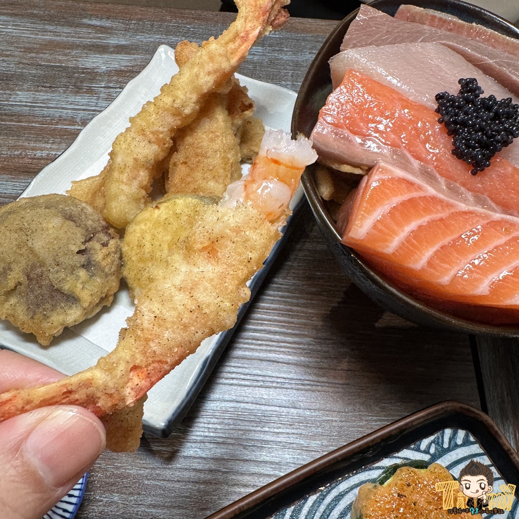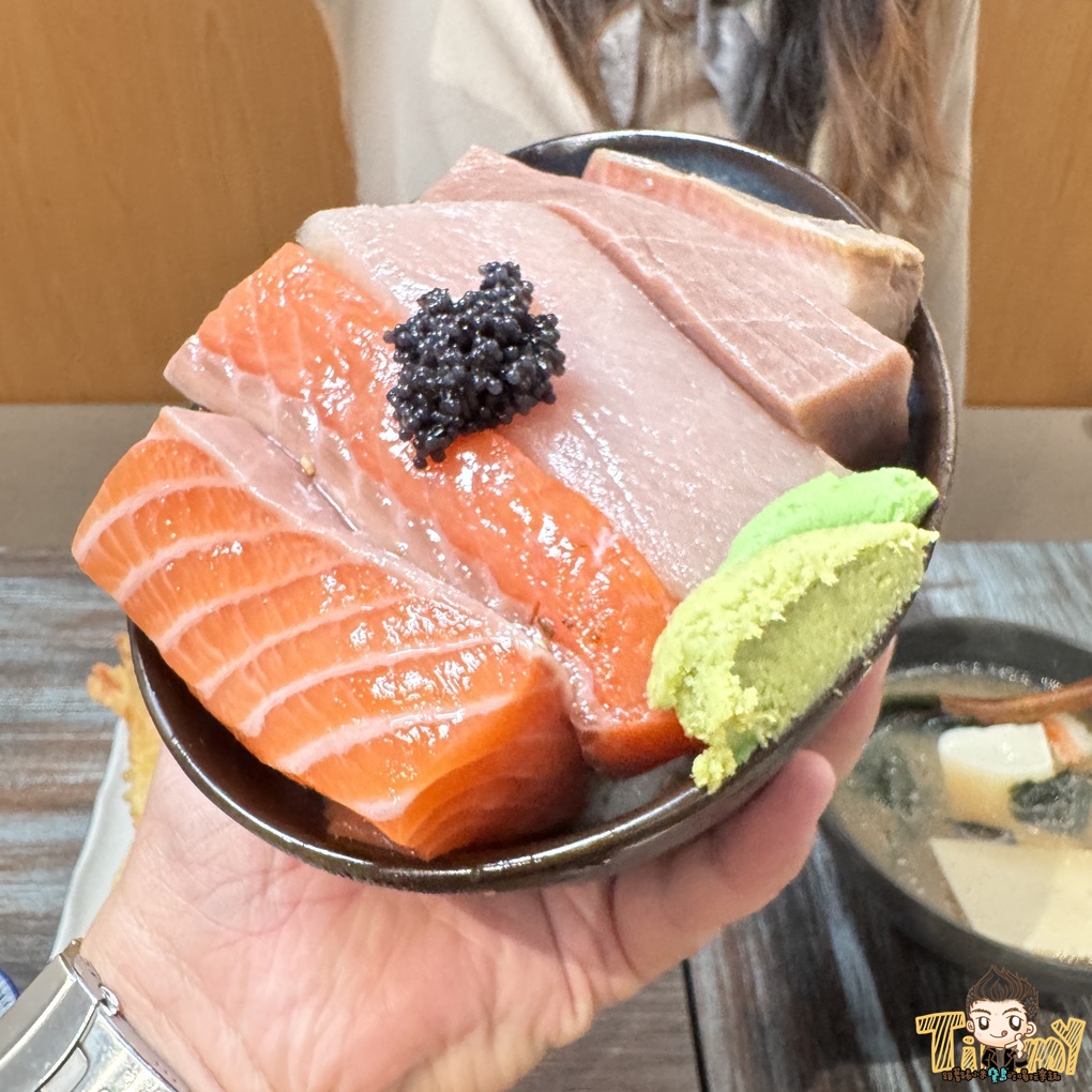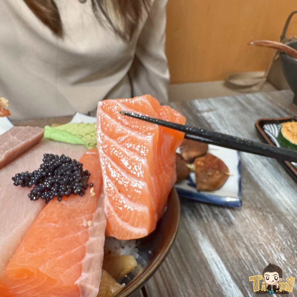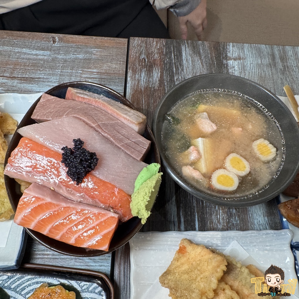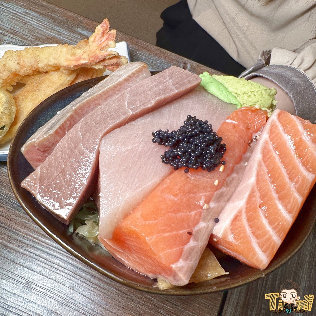丁丁生魚丼飯(350元),有鮭魚、鮪魚、旗魚、紅甘、甜蝦及蝦卵等配料,搭配溫熱的米飯,讓生魚片的口感更為軟嫩喔。
