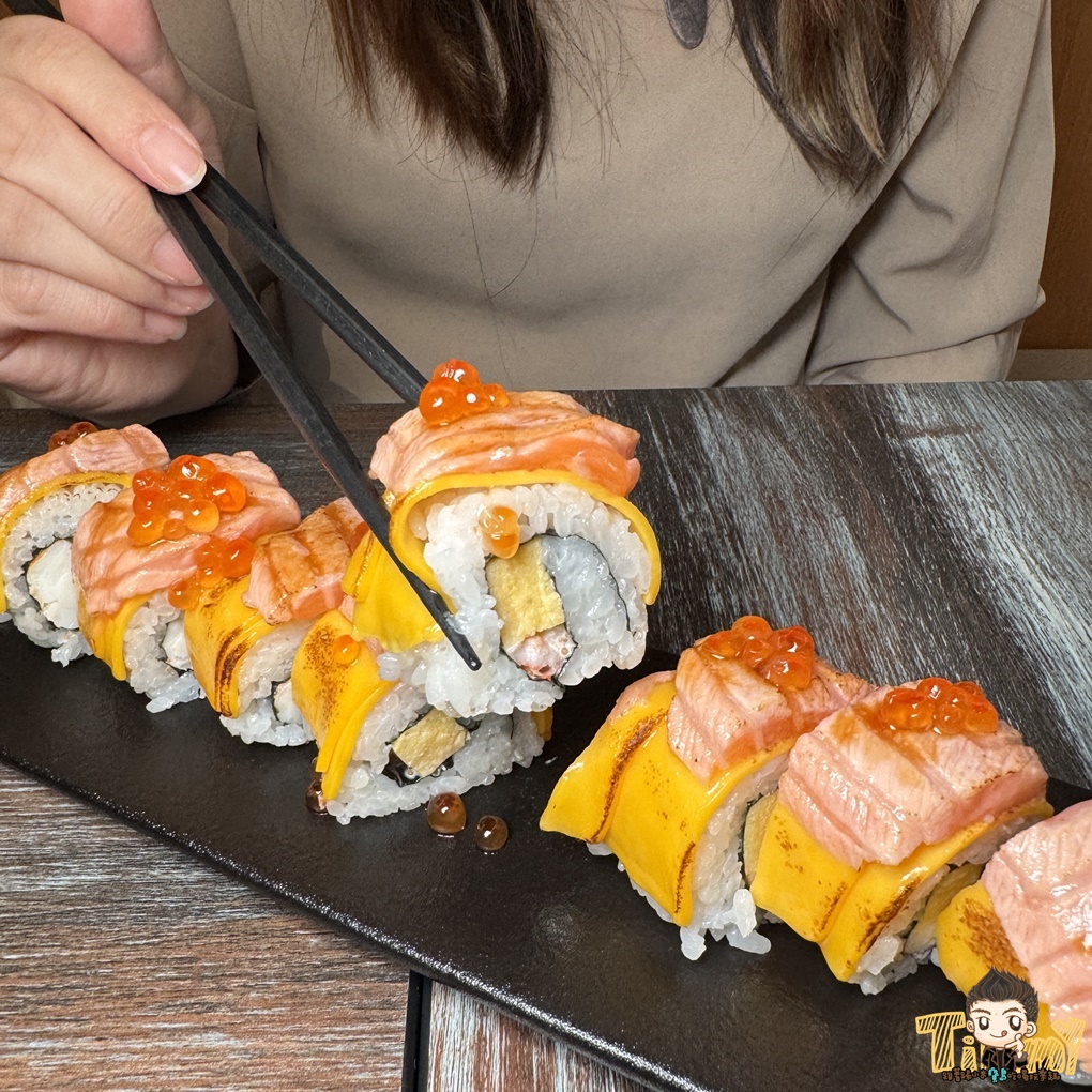 炙燒鮭魚起士加州捲(330元)內餡有草蝦、玉子燒,上頭加上炙燒鮭魚、起司和鮭魚卵,一口咬下多層次的鮮甜,大小朋友都會很喜歡。