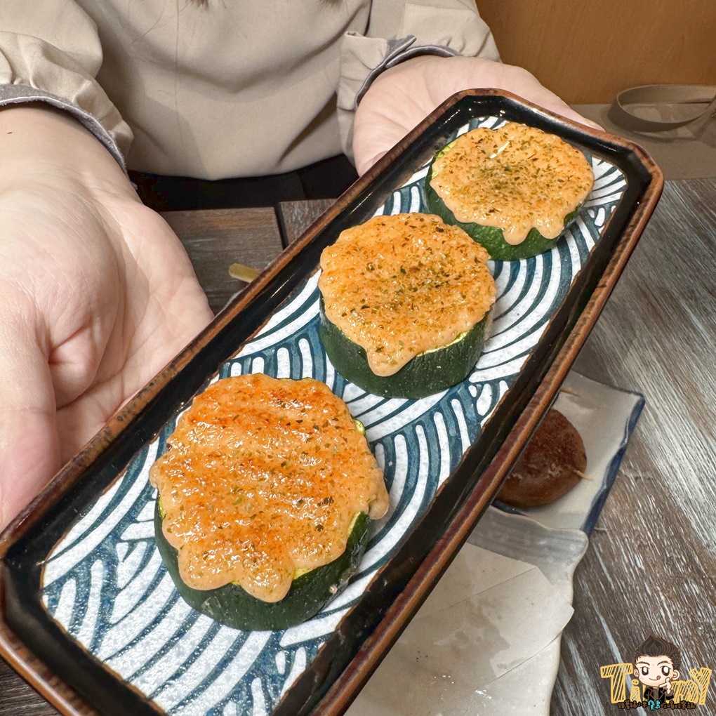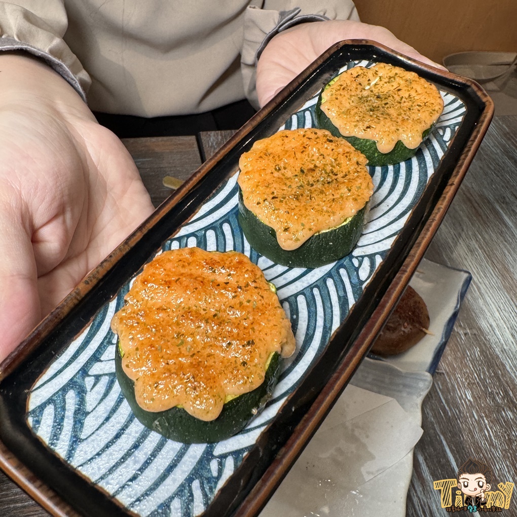明太子櫛瓜(80元)招牌明太子醬炙燒後鹹香又鮮,加上多汁的櫛瓜很好吃。