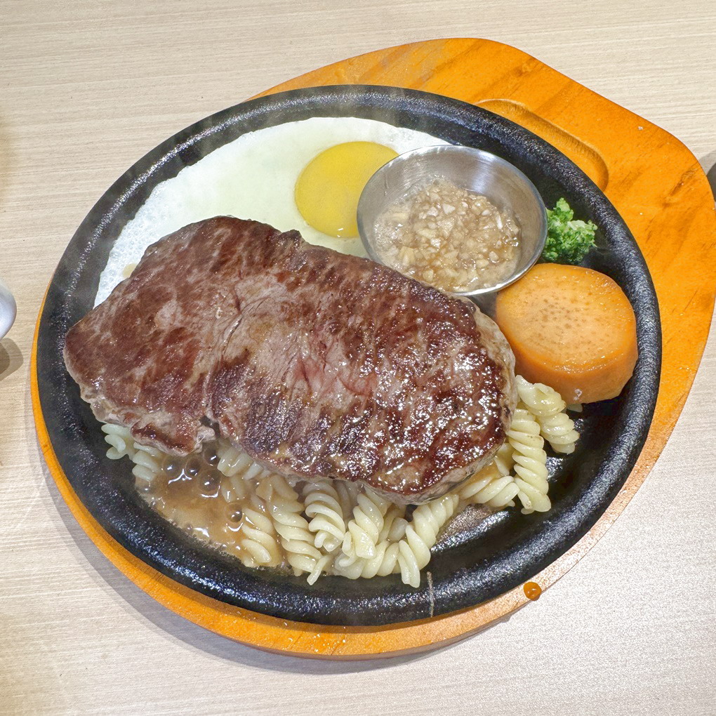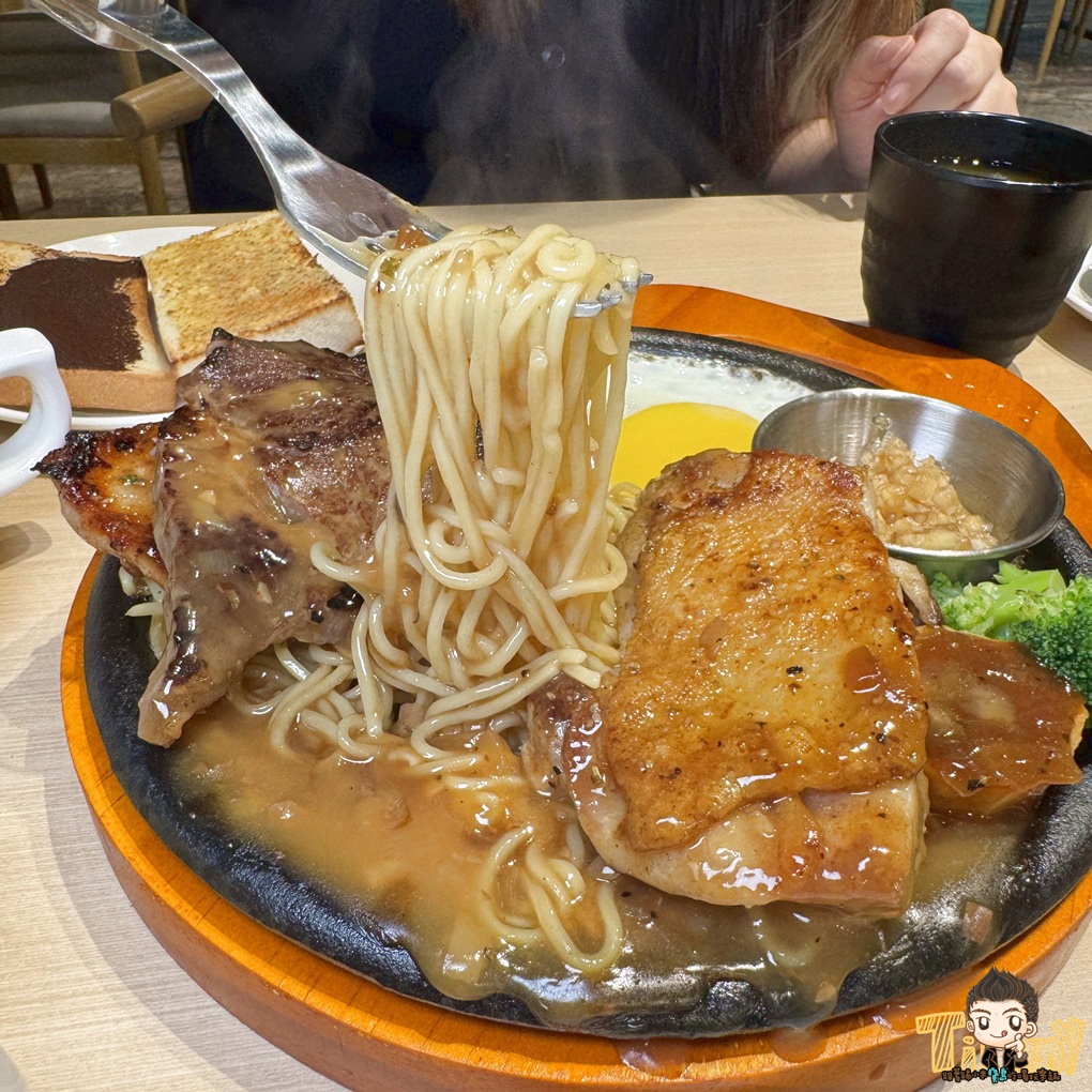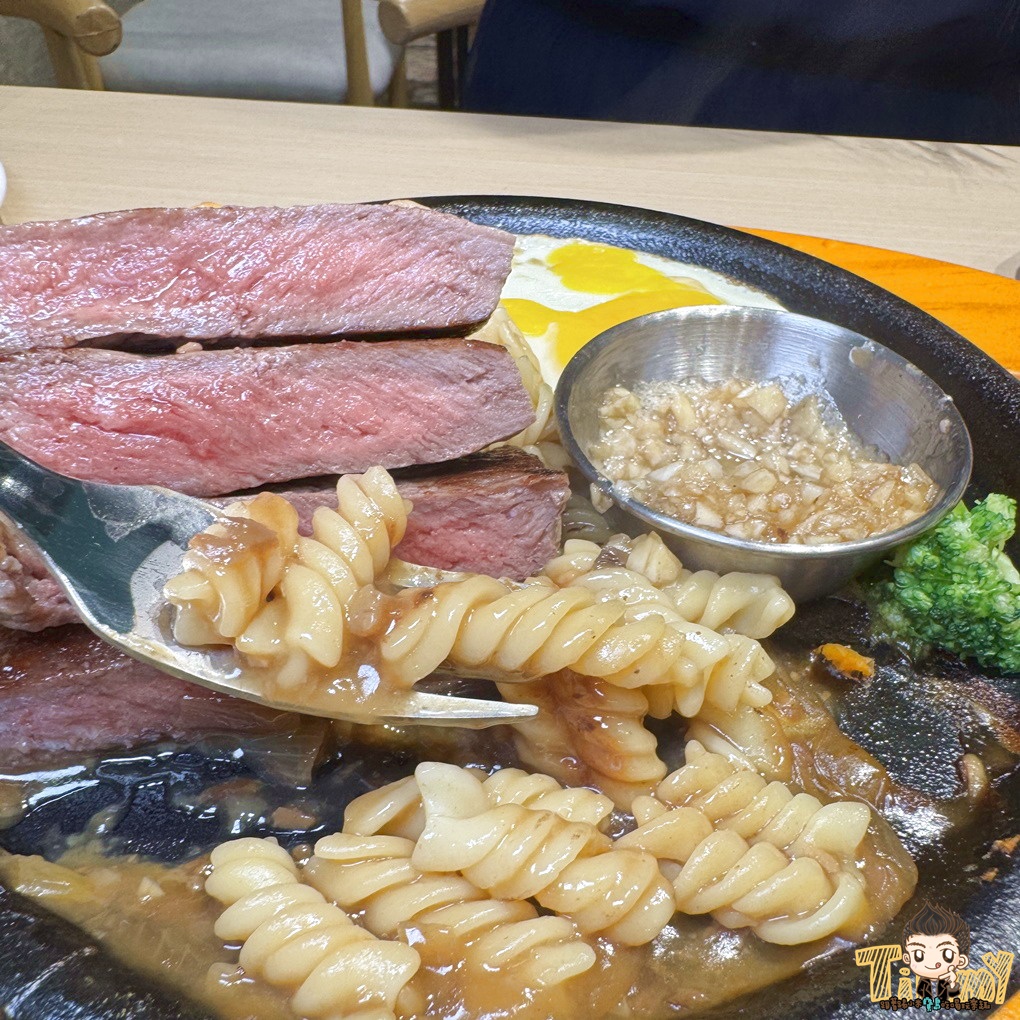 每一份牛排有地瓜蔬菜及雞蛋麵食,麵食油麵跟螺旋麵二選一,不想吃麵還可以換雞蛋。
