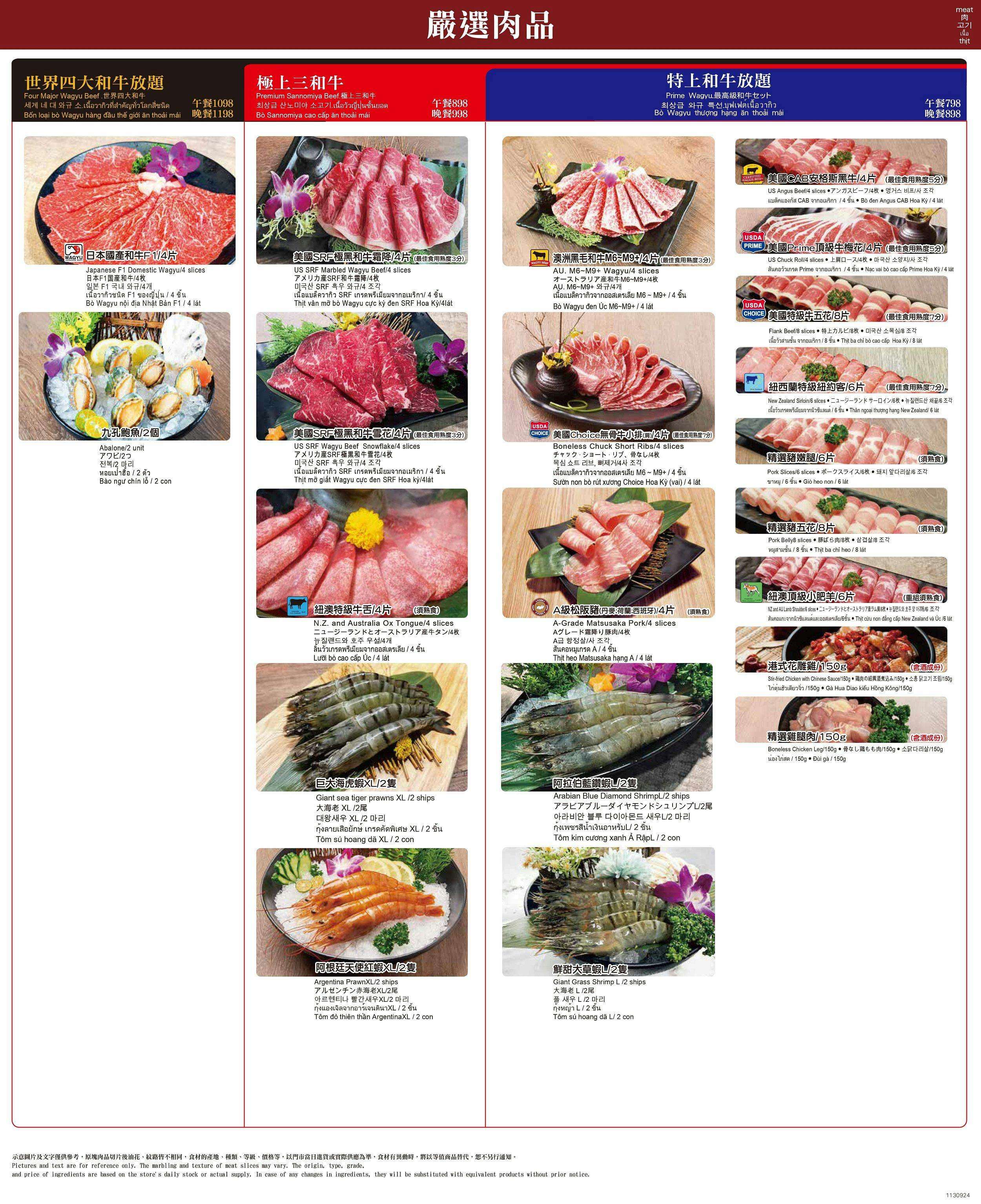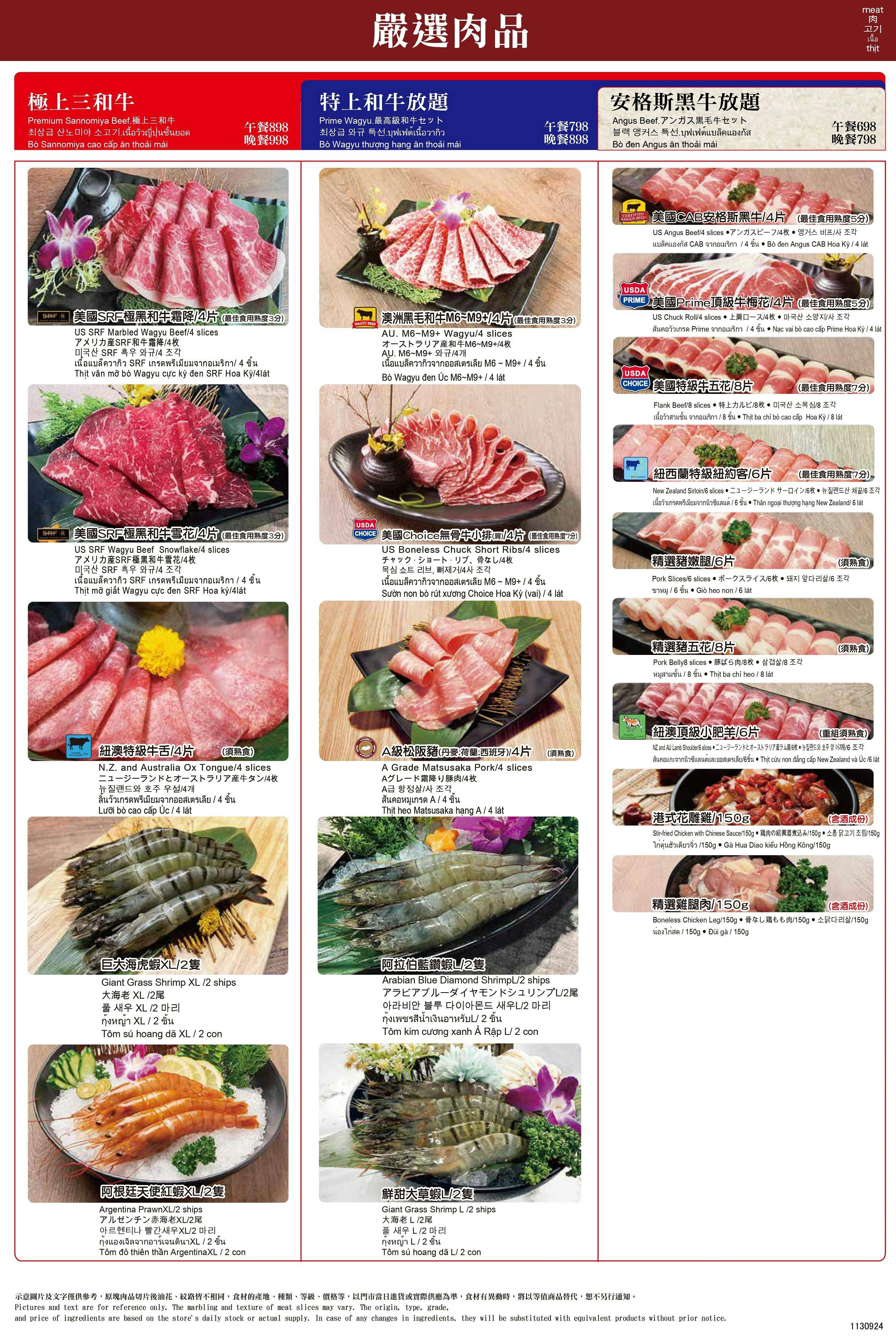 「極上三和牛」方案還可無限享用四種大蝦:巨大海虎蝦、阿根廷天使紅蝦、阿拉伯藍鑽蝦、鮮甜大草蝦通通無限供應!