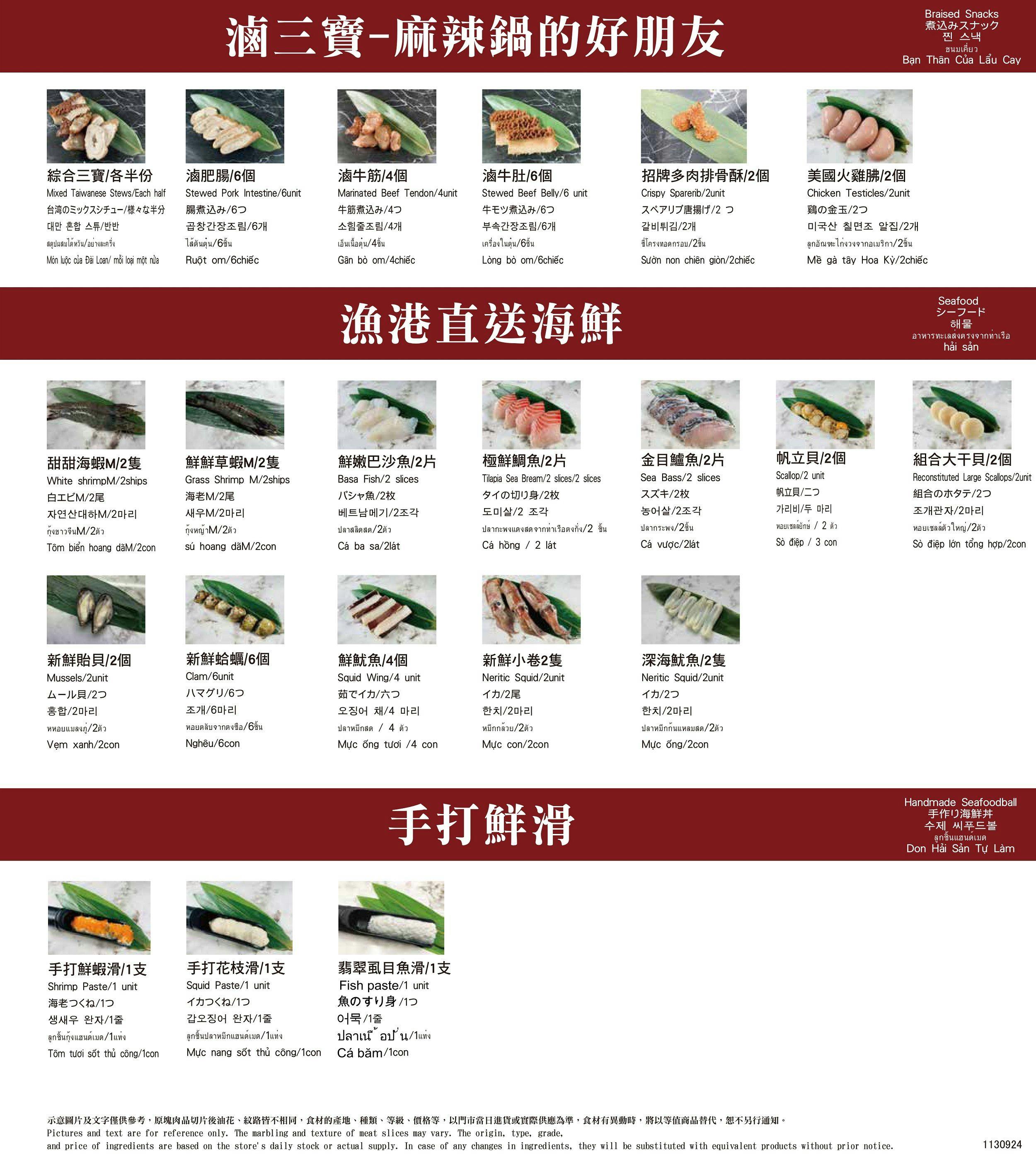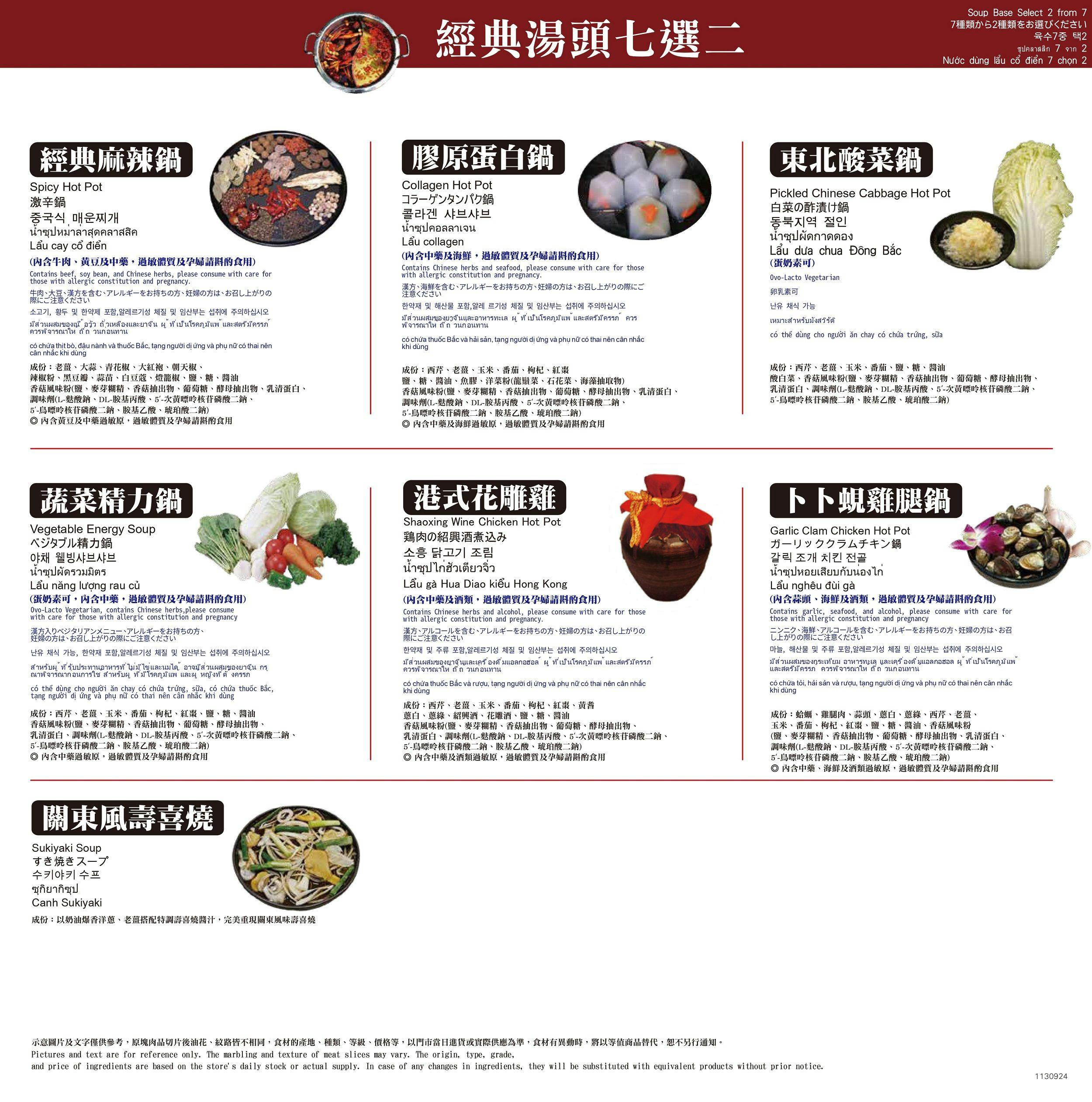 湯底七選二,有經典麻辣鍋,還有 6 款不辣的經典湯頭可以選擇,可以滿足不同喜好的客人 ![]()