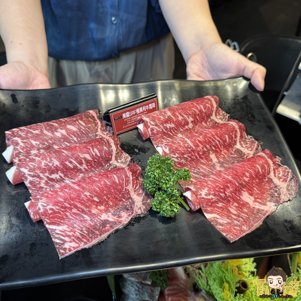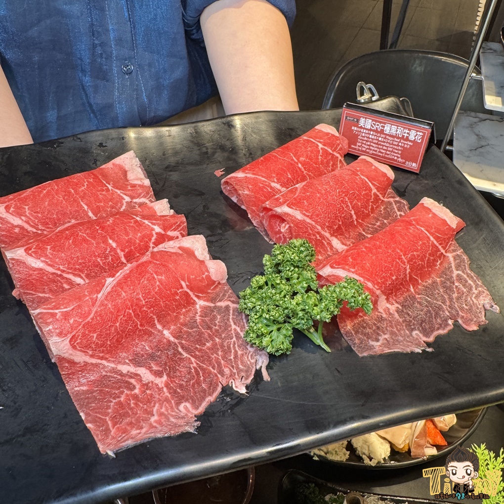 美國 SRF 極黑和牛雪花大概涮5分熟,帶粉嫩色澤,就可以享用鮮甜軟嫩的口感