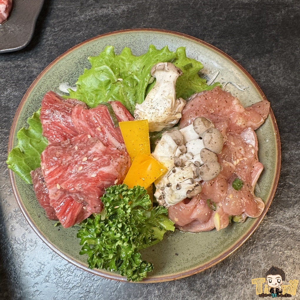 .肉品:厚切無骨牛小排、醬燒肩胛牛里肌、醬燒牛五花、牛角切、椒鹽梅花豬、蔥鹽雞腿肉。