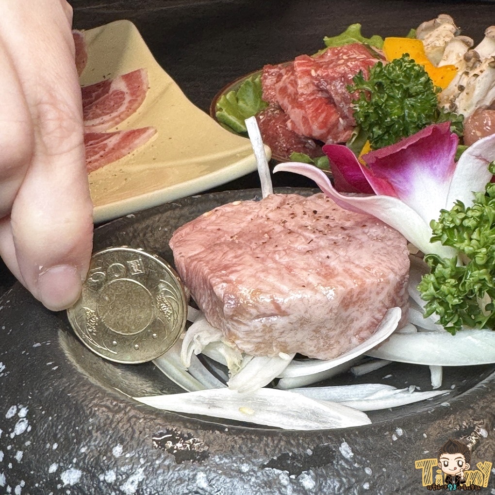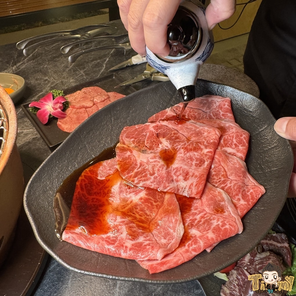 油花分布很漂亮,燒烤前倒入特製醬汁,再將兩面烤至5分熟,有入口即化的口感。